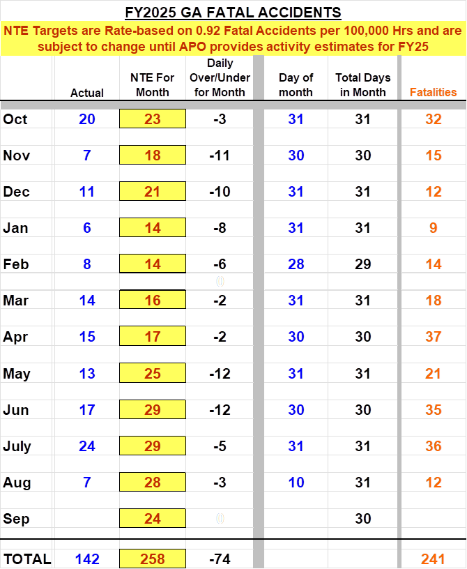 Here's a look at the GA fatal accident rate for fiscal year (FY) 2025. As you can see in the chart here, the estimated GA fatal accident rate is at 0.60 accidents per 100,000 flight hours (as of Aug 15, 2025), well below the yearly target of 0.92. You can also see the total GA fatal accidents broken out by month in FY25 here (as of Aug 10, 2025).